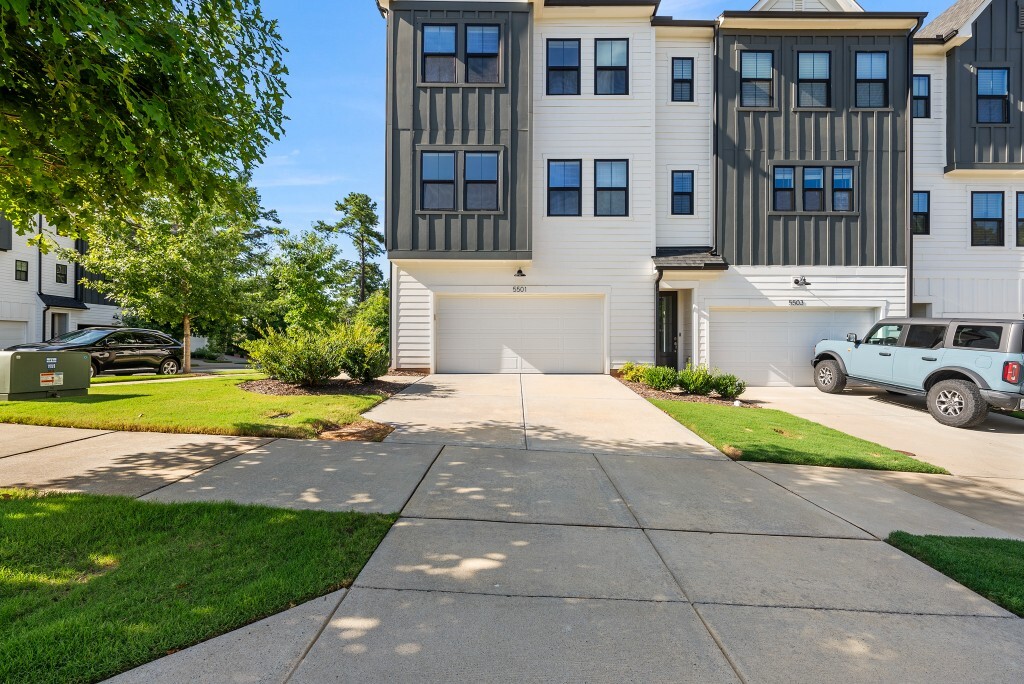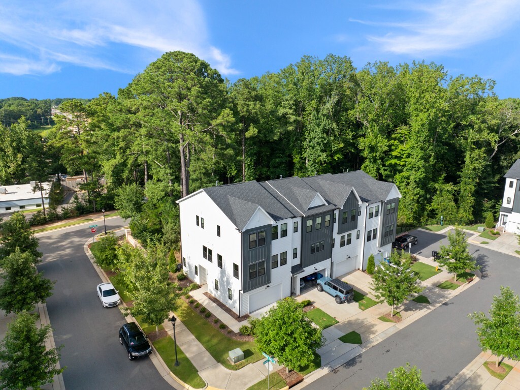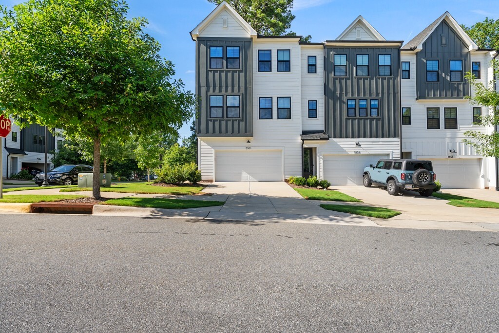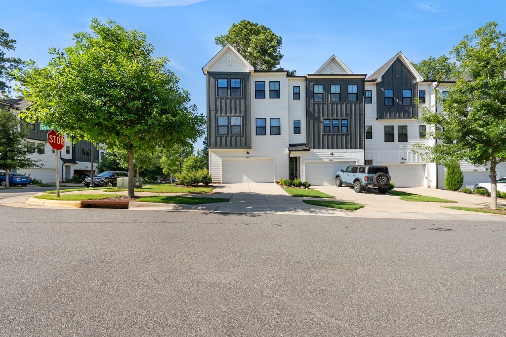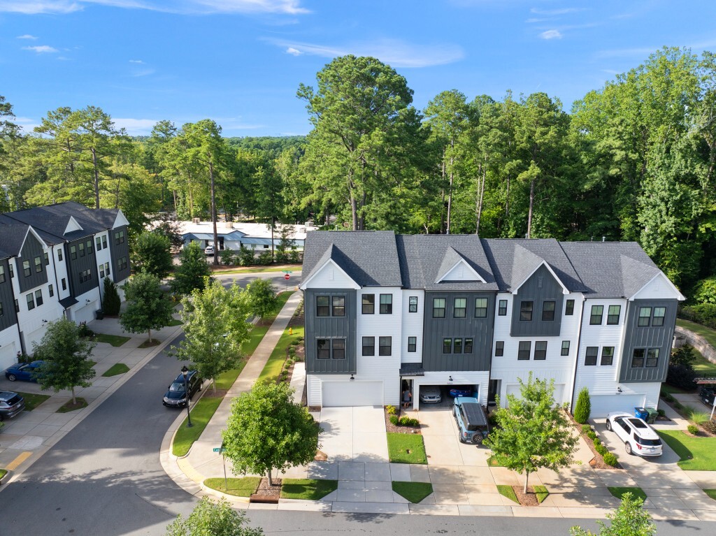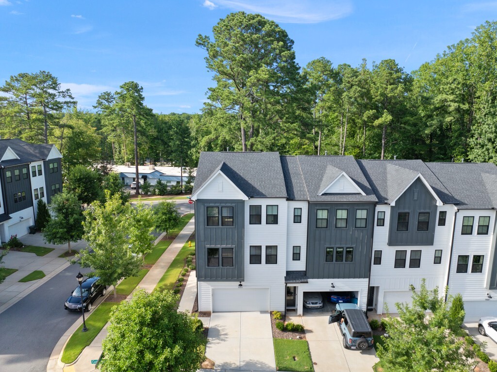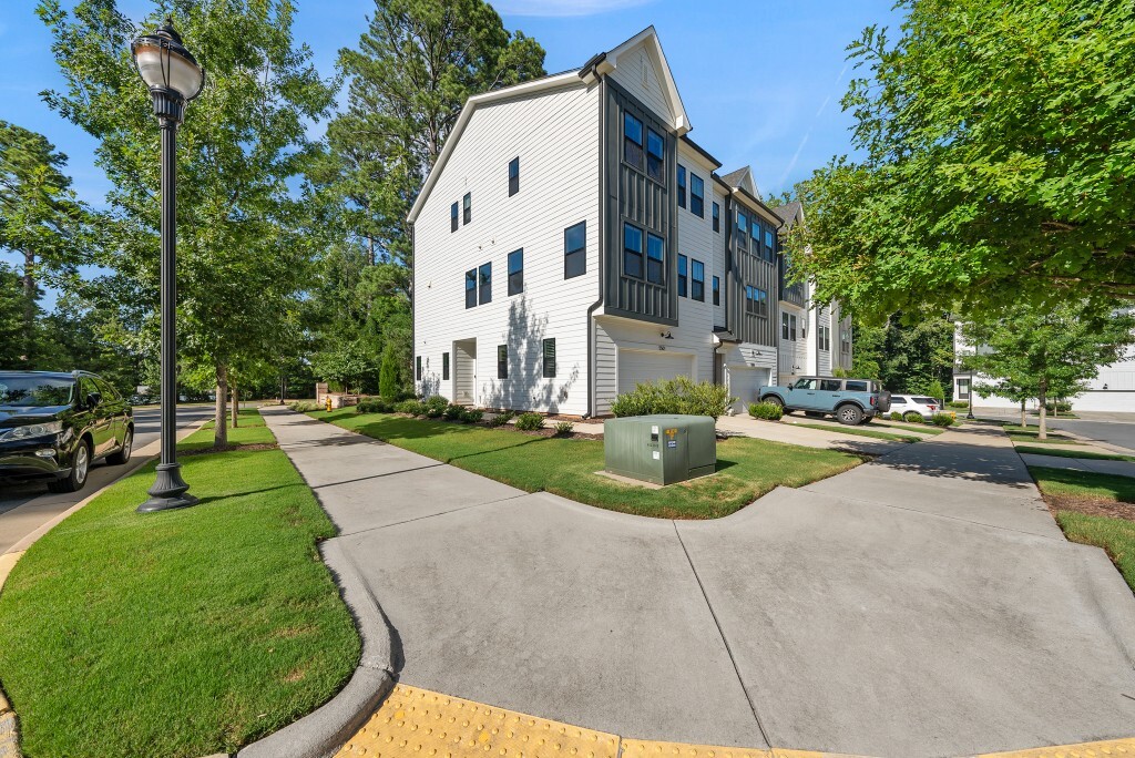 Experience modern comfort in this immaculate end unit townhome, boasting one of the neighborhood's largest floor plans and best price per square foot! Situated mere moments from Walnut Creek Trail and Lake Johnson, and with easy access to major thoroughfares including 440, I-40, US 1, and Hwy 64, convenience is at your doorstep. Enjoy proximity to shopping, dining, and entertainment, with Crossroads Shopping Plaza just a stone's throw away. Inside, this contemporary residence boasts the best price per square foot in the neighborhood. Featuring 3 bedrooms, each with its own ensuite bath, this home offers unparalleled convenience and privacy. The kitchen is equipped with stainless steel appliances, granite countertops and a spacious center island. As an added benefit, the refrigerator water line is plumbed for a Kinetico filtration system. Elegant crown molding, an open floor plan, and smart thermostats enhance the modern living experience. The first floor includes a 2 car garage, a large bedroom with an ensuite bath and access to a covered patio for relaxed outdoor living. Upstairs, the main living area delights with a well-appointed kitchen, breakfast area, spacious deck, a pantry,a powder room, and an open family room flooded with natural light through expansive windows. The third floor hosts two additional bedrooms, each with an ensuite bath, and a convenient laundry closet. This home won't last long!
