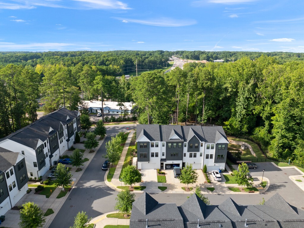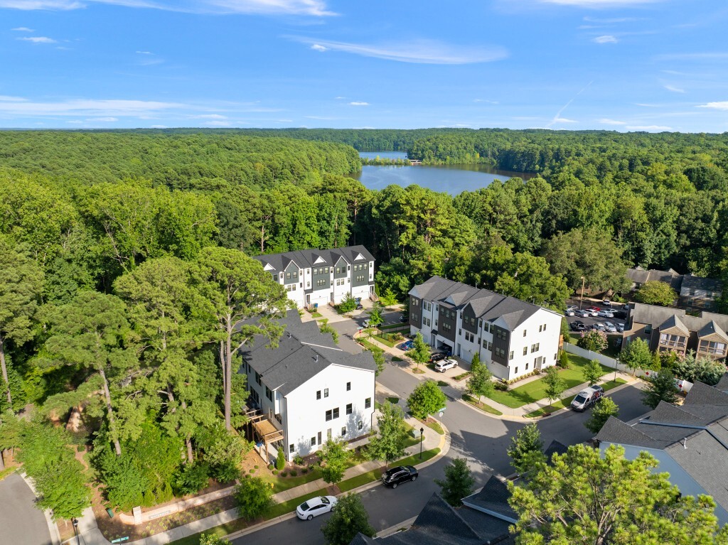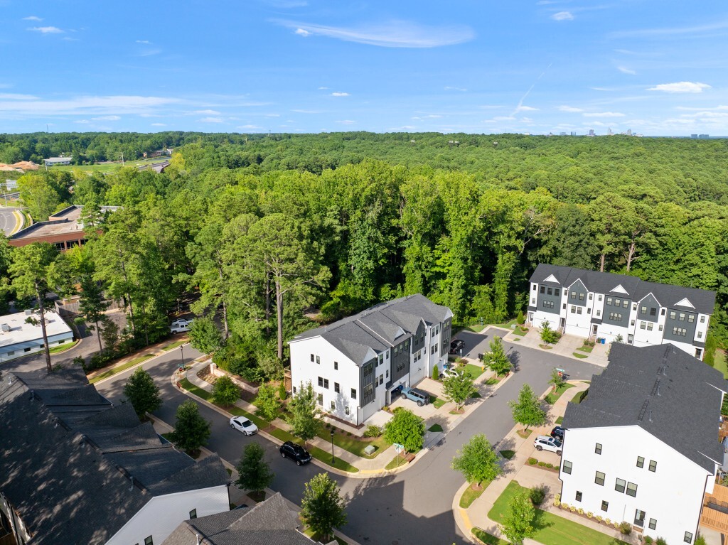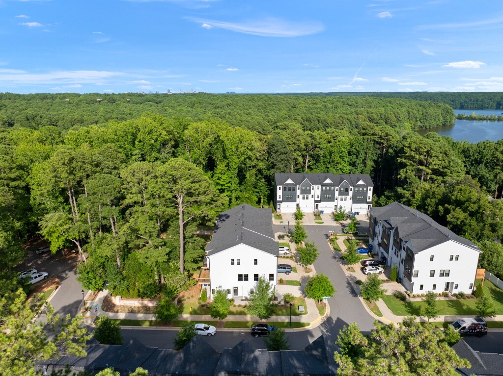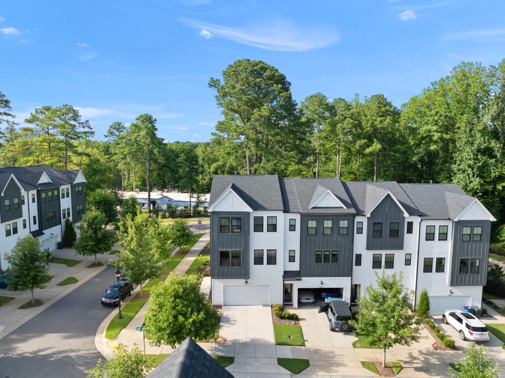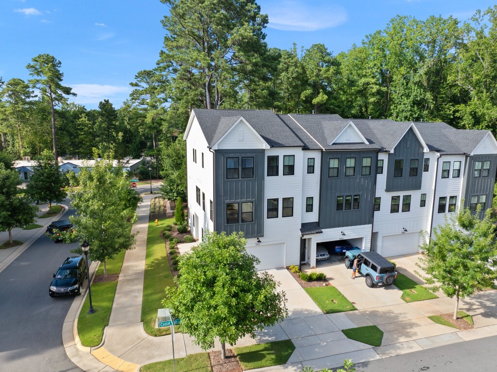 Experience modern comfort in this immaculate end unit townhome, boasting one of the neighborhood's largest floor plans and best price per square foot! Situated mere moments from Walnut Creek Trail and Lake Johnson, and with easy access to major thoroughfares including 440, I-40, US 1, and Hwy 64, convenience is at your doorstep. Enjoy proximity to shopping, dining, and entertainment, with Crossroads Shopping Plaza just a stone's throw away. Inside, this contemporary residence boasts the best price per square foot in the neighborhood. Featuring 3 bedrooms, each with its own ensuite bath, this home offers unparalleled convenience and privacy. The kitchen is equipped with stainless steel appliances, granite countertops and a spacious center island. As an added benefit, the refrigerator water line is plumbed for a Kinetico filtration system. Elegant crown molding, an open floor plan, and smart thermostats enhance the modern living experience. The first floor includes a 2 car garage, a large bedroom with an ensuite bath and access to a covered patio for relaxed outdoor living. Upstairs, the main living area delights with a well-appointed kitchen, breakfast area, spacious deck, a pantry,a powder room, and an open family room flooded with natural light through expansive windows. The third floor hosts two additional bedrooms, each with an ensuite bath, and a convenient laundry closet. This home won't last long!