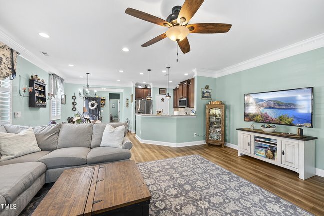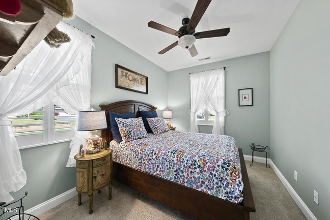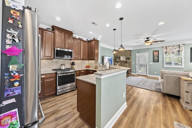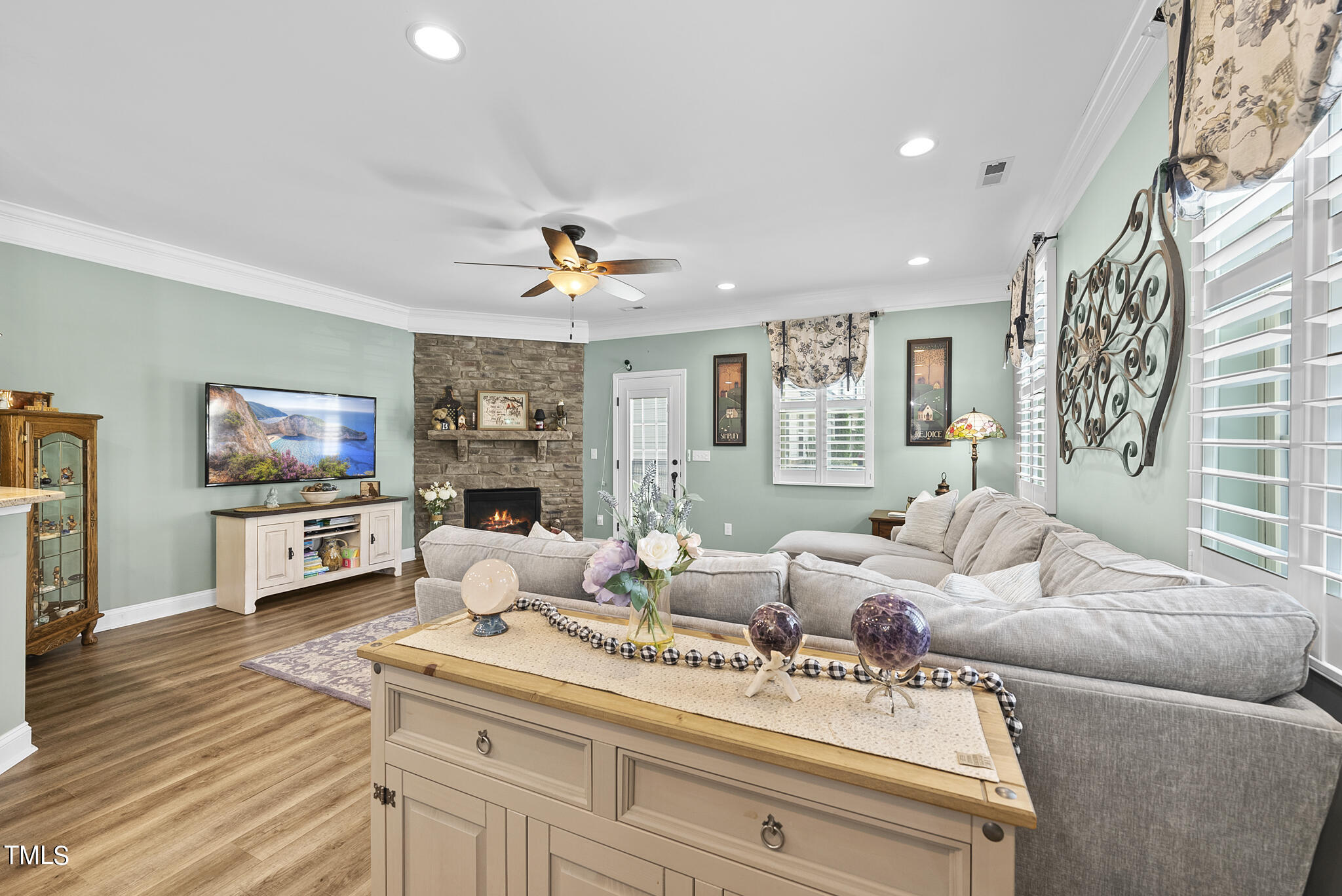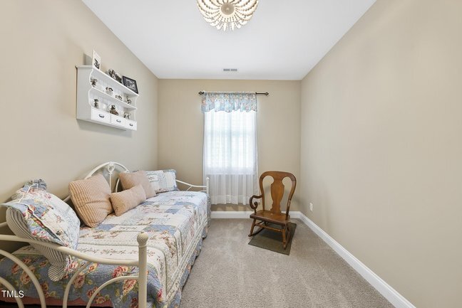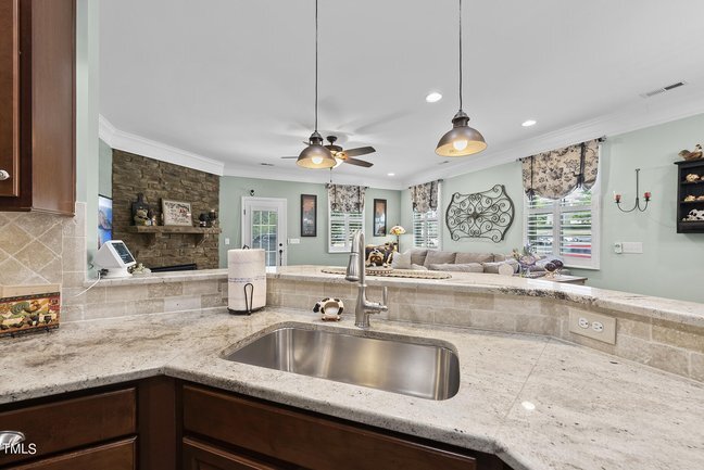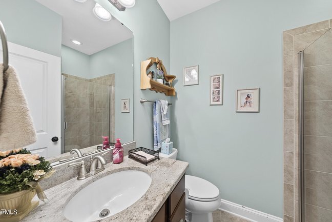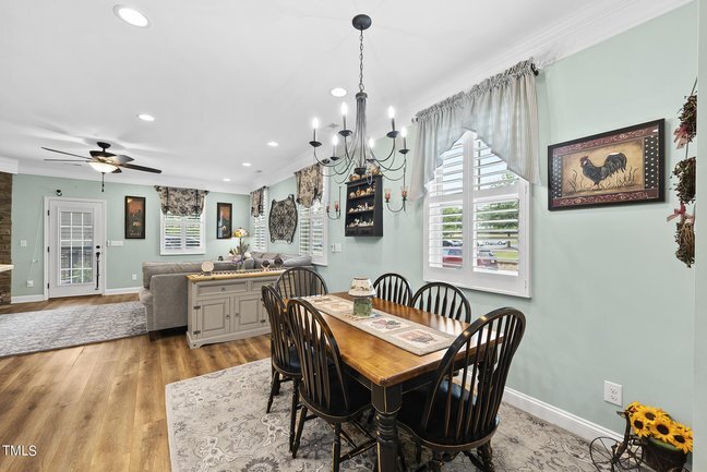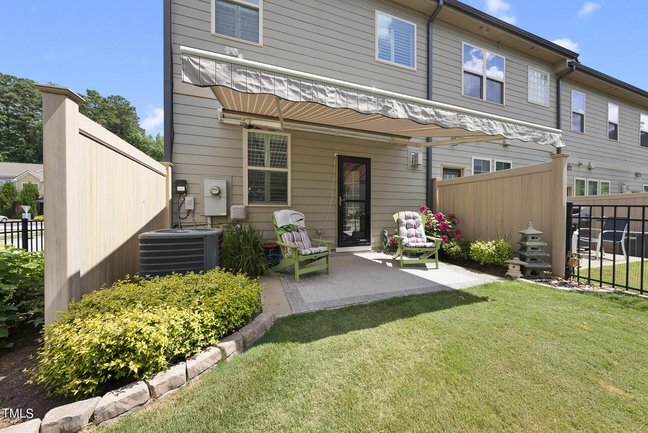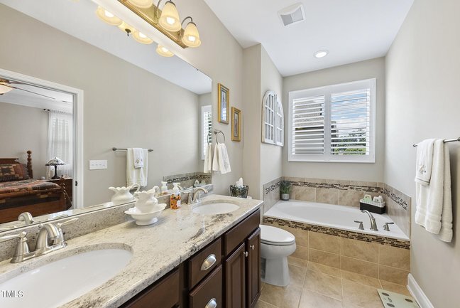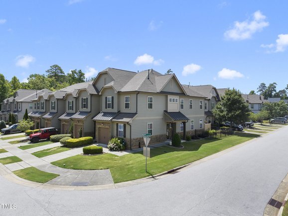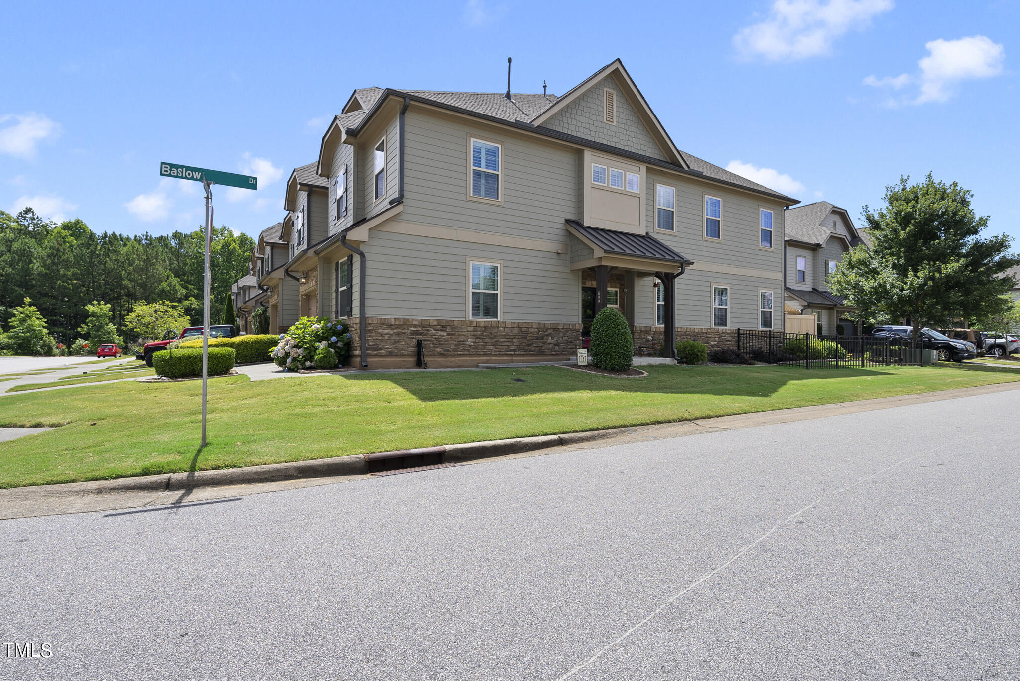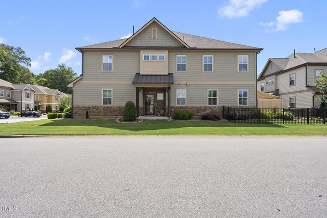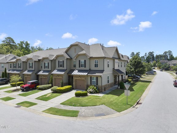 Stunning End Unit Townhome! This Apex Home is an easy commute to Holly Springs, Cary, and Raleigh! Beautiful plantation shutters surround home! Spacious family room with cozy, stone surround fireplace overlooks the eat-in kitchen, creating a desirable open floor plan! Kitchen features stainless steel appliances, granite countertops, tile backsplash and pantry! The first floor bedroom option is just steps from full bathroom with granite countertop vanity and glass sink, perfect for guests! Spacious owner suite with walk-in closet features a large bathroom with dual vanities, soaking, tub, and glass shower! Second floor features two additional bedroom options as well as shared full bathroom! Sizable loft is an ideal second family room! Corner lot offers extra natural space! Covered concrete patio with privacy screens overlooks fully fenced backyard and is a perfect place to enjoy the sunshine this summer!