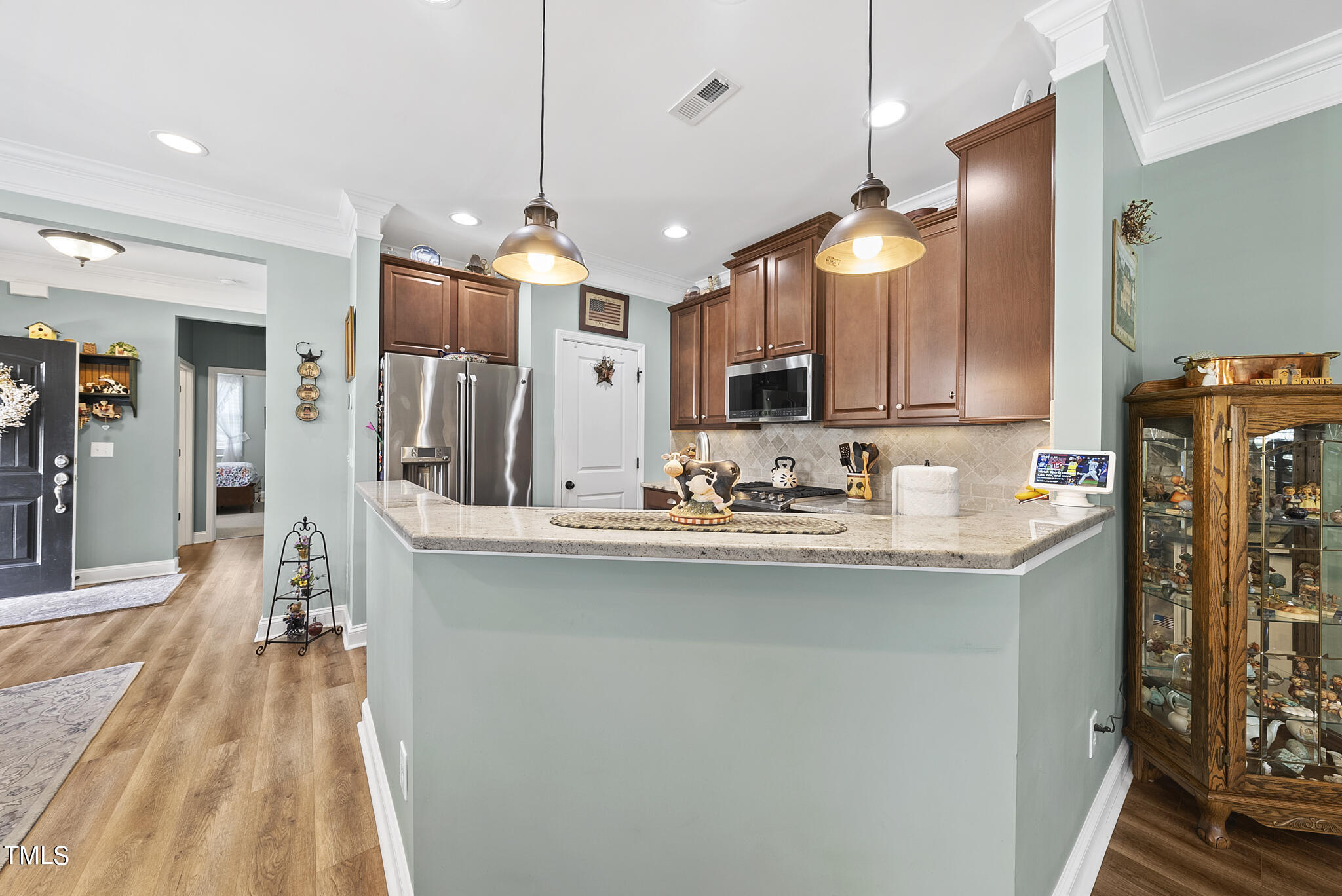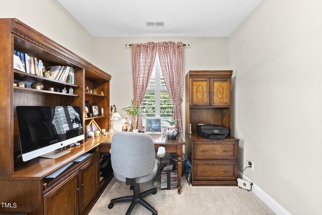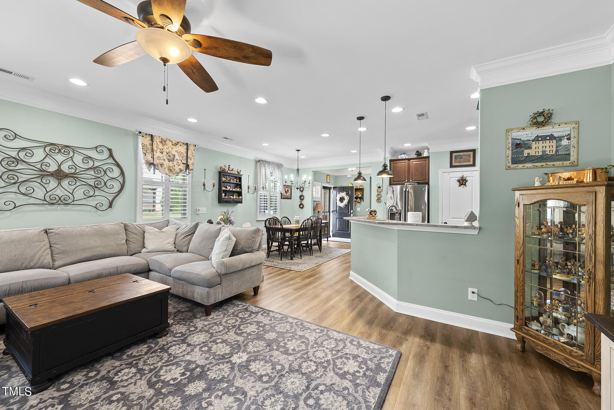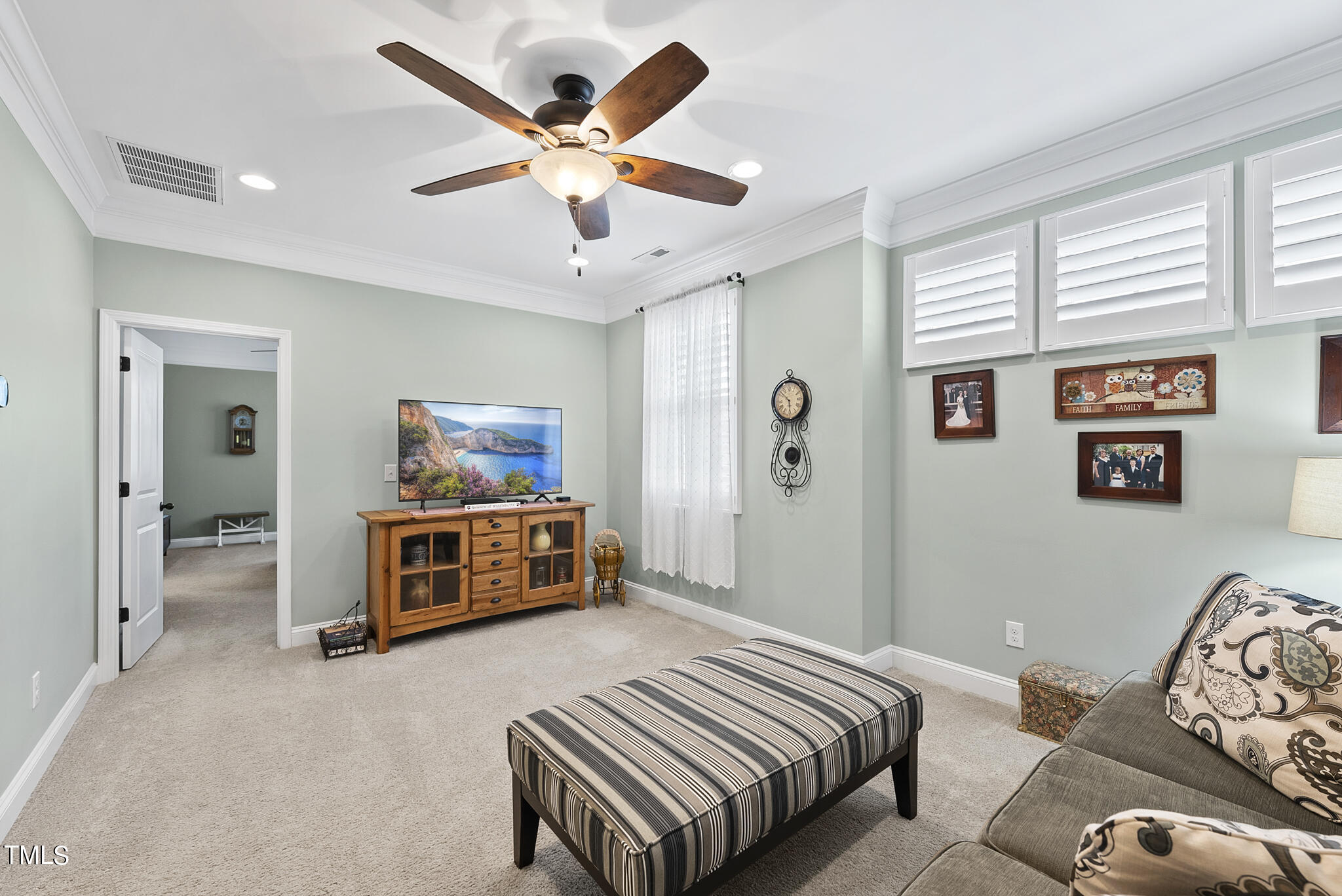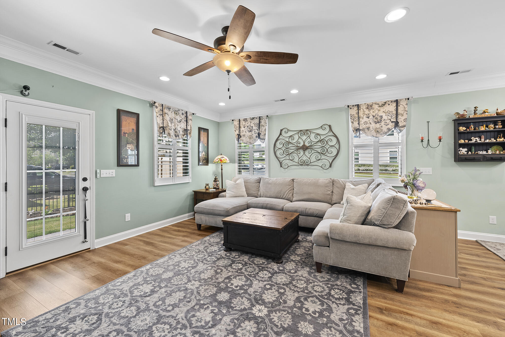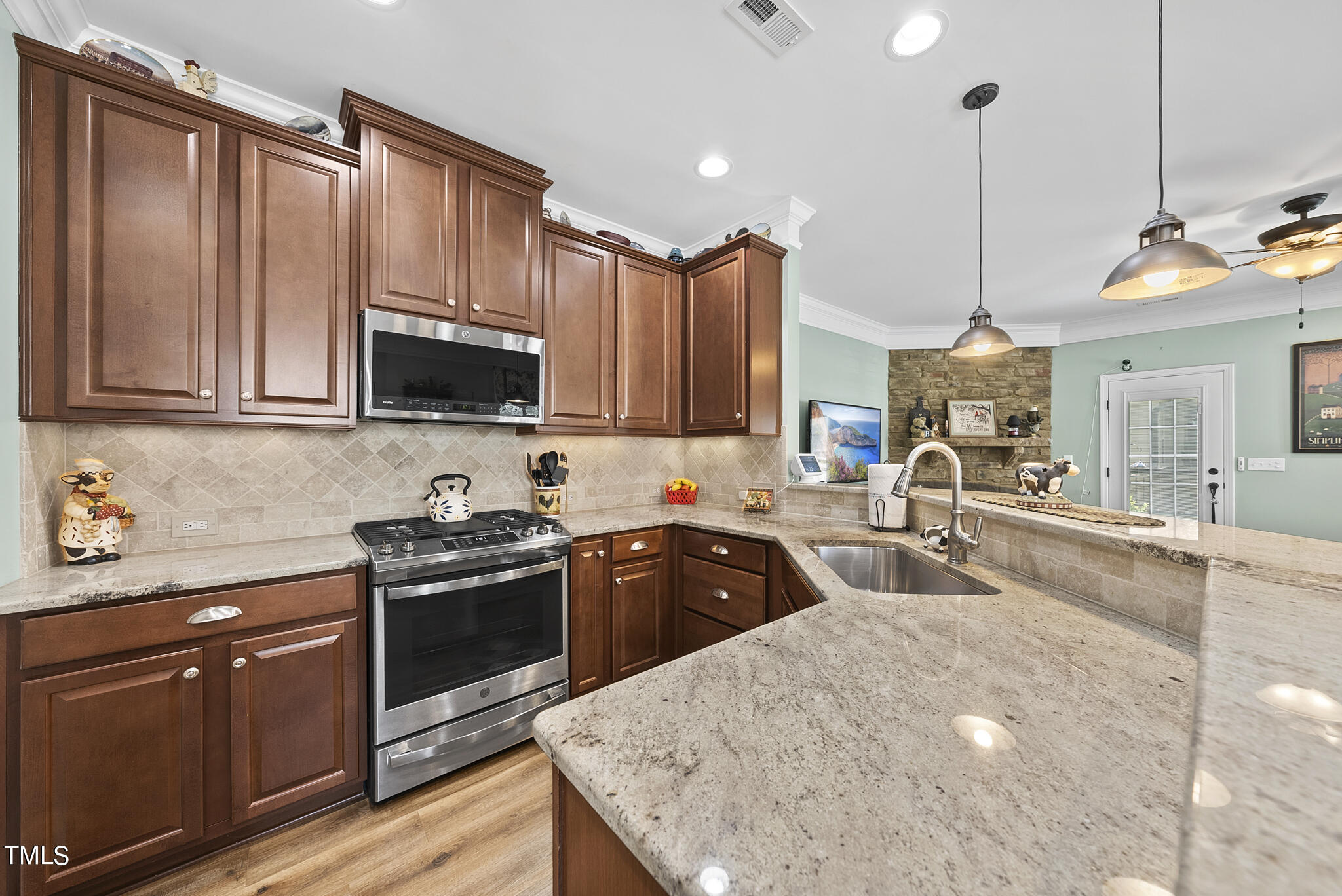 Stunning End Unit Townhome! This Apex Home is an easy commute to Holly Springs, Cary, and Raleigh! Beautiful plantation shutters surround home! Spacious family room with cozy, stone surround fireplace overlooks the eat-in kitchen, creating a desirable open floor plan! Kitchen features stainless steel appliances, granite countertops, tile backsplash and pantry! The first floor bedroom option is just steps from full bathroom with granite countertop vanity and glass sink, perfect for guests! Spacious owner suite with walk-in closet features a large bathroom with dual vanities, soaking, tub, and glass shower! Second floor features two additional bedroom options as well as shared full bathroom! Sizable loft is an ideal second family room! Corner lot offers extra natural space! Covered concrete patio with privacy screens overlooks fully fenced backyard and is a perfect place to enjoy the sunshine this summer!